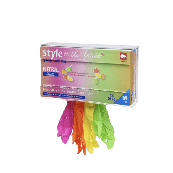 Los guantes de nitrilo Tutti Frutti PF (multicolor 96 uds) ofrecen una protección excelente tanto en entornos médicos como en tu día a día. Al ser guantes sin polvo, evitan irritaciones en la piel y resultan ideales para uso pediátrico y dental. Cada unidad presenta un atractivo color, perfecto para quienes buscan guantes desechables con personalidad. Además, su ajuste ceñido garantiza la máxima sensibilidad táctil sin renunciar a la comodidad.